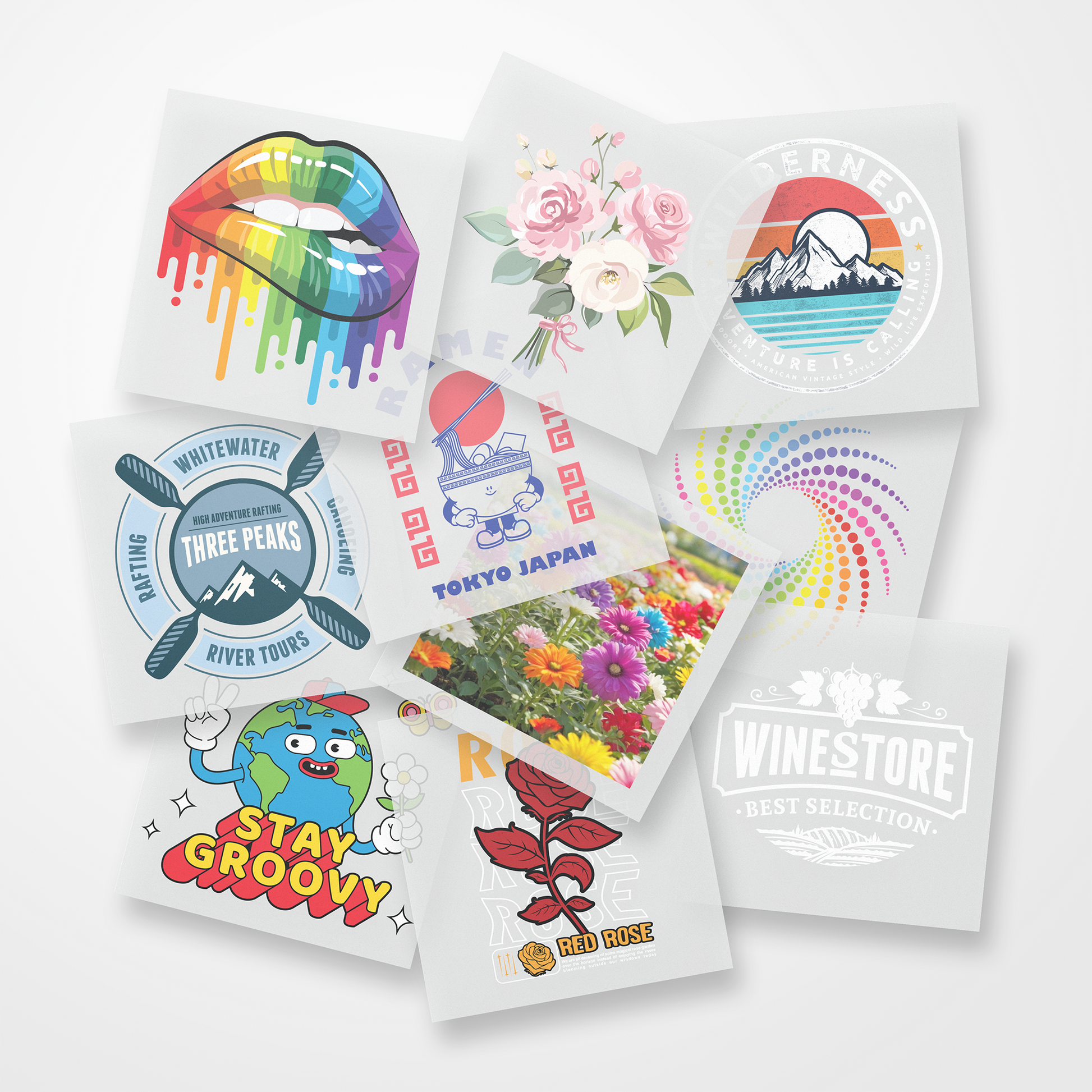 A sample pack of our DTF prints showcasing their quality and versatility. The prints are free, you just need to cover the cost of shipping.